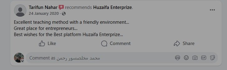 Tarifun Nahar recommends Huzaifa Enterprize. 24 January 2020 · 🌎 Excellent teaching method with a friendly environment... Great place for entrepreneurs... Best wishes for the Best platform Huzaifa Enterprize...