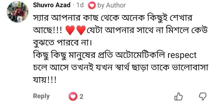 শুভ্র আজাদ স্যার আপনার কাছ থেকে অনেক কিছুই শেখার আছে!!! যেটা আপনার সাথে না মিশলে কেউ বুঝতে পারবে না। কিছু কিছু মানুষের প্রতি অটোমেটিকলি respect চলে আসে তখনই যখন স্বার্থ ছাড়া তাকে ভালোবাসা যায়!!!