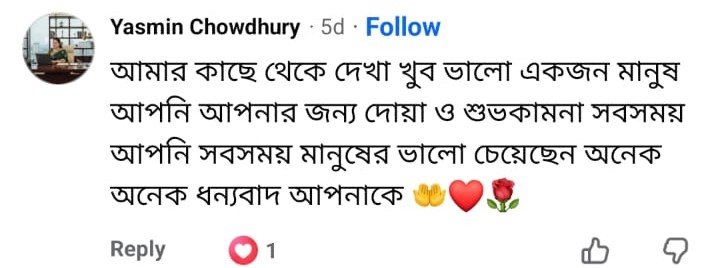 আমার কাছে থেকে দেখা খুব ভালো একজন মানুষ আপনি। আপনার জন্য দোয়া ও শুভকামনা সবসময়। আপনি সবসময় মানুষের ভালো চেয়েছেন, অনেক অনেক ধন্যবাদ আপনাকে।