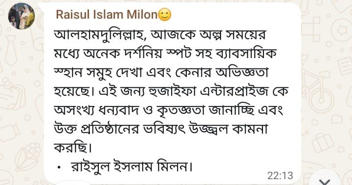 পরিদর্শন: অল্প সময়ের মধ্যে অনেকগুলো দর্শনীয় স্থান এবং ব্যবসায়িক কেন্দ্র দেখার সুযোগ হয়েছে। ব্যবসায়িক অভিজ্ঞতা: ব্যবসায়িক স্থানসমূহ দেখার পাশাপাশি পণ্য কেনার বিষয়ে বাস্তব অভিজ্ঞতা অর্জিত হয়েছে। কৃতজ্ঞতা: চমৎকার এই অভিজ্ঞতার জন্য হুজাইফা এন্টারপ্রাইজকে অসংখ্য ধন্যবাদ ও কৃতজ্ঞতা জানিয়েছেন। শুভকামনা: তিনি উক্ত প্রতিষ্ঠানের উজ্জ্বল ভবিষ্যৎ কামনা করেছেন।