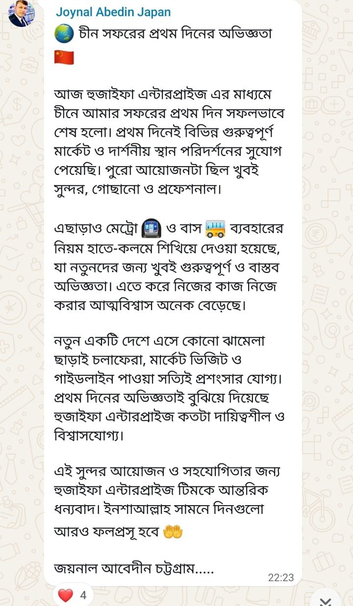 আজ হুজাইফা এন্টারপ্রাইজ এর মাধ্যমে চীনে আমার সফরের প্রথম দিন সফলভাবে শেষ হলো। প্রথম দিনেই বিভিন্ন গুরুত্বপূর্ণ মার্কেট ও দর্শনীয় স্থান পরিদর্শনের সুযোগ পেয়েছি। পুরো আয়োজনটা ছিল খুবই সুন্দর, গোছানো ও প্রফেশনাল। এছাড়াও মেট্রো 🚇 ও বাস 🚌 ব্যবহারের নিয়ম হাতে-কলমে শিখিয়ে দেওয়া হয়েছে, যা নতুনদের জন্য খুবই গুরুত্বপূর্ণ ও বাস্তব অভিজ্ঞতা। এতে করে নিজের কাজ নিজে করার আত্মবিশ্বাস অনেক বেড়েছে। নতুন একটি দেশে এসে কোনো ঝামেলা ছাড়াই চলাফেরা, মার্কেট ভিজিট ও গাইডলাইন পাওয়া সত্যিই প্রশংসার যোগ্য। প্রথম দিনের অভিজ্ঞতাই বুঝিয়ে দিয়েছে হুজাইফা এন্টারপ্রাইজ কতটা দায়িত্বশীল ও বিশ্বাসযোগ্য। এই সুন্দর আয়োজন ও সহযোগিতার জন্য হুজাইফা এন্টারপ্রাইজ টিমকে আন্তরিক ধন্যবাদ। ইনশাআল্লাহ সামনে দিনগুলো আরও ফলপ্রসূ হবে। 🙌 জয়নাল আবেদীন চট্টগ্রাম.....